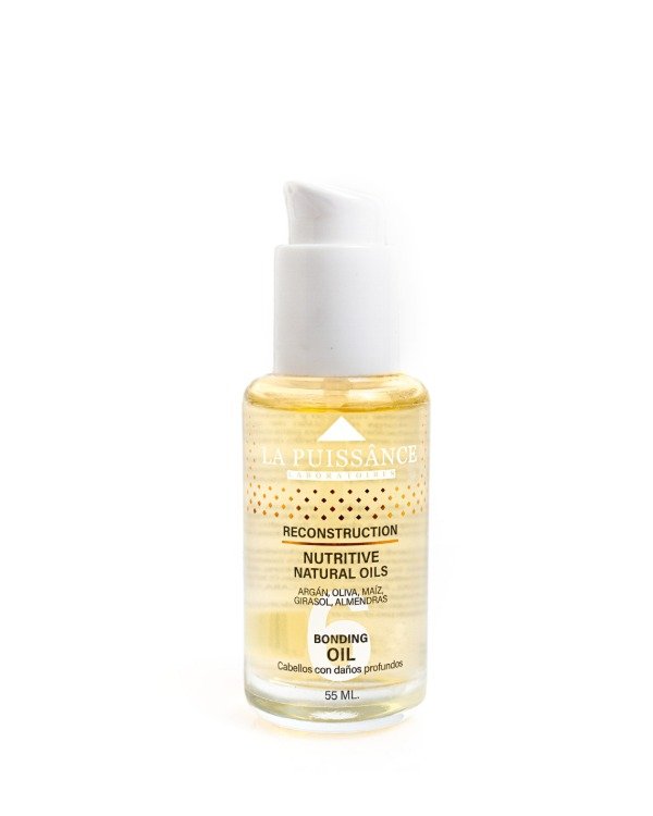 Paso 6 «bonding oil»: es un serum termo activo que se aplica de medios a puntas, para nutrir, hidratar y definir peinados. Es de uso cotidiano y lo podemos aplicar en cualquier momento del día, no deja restos de oleos