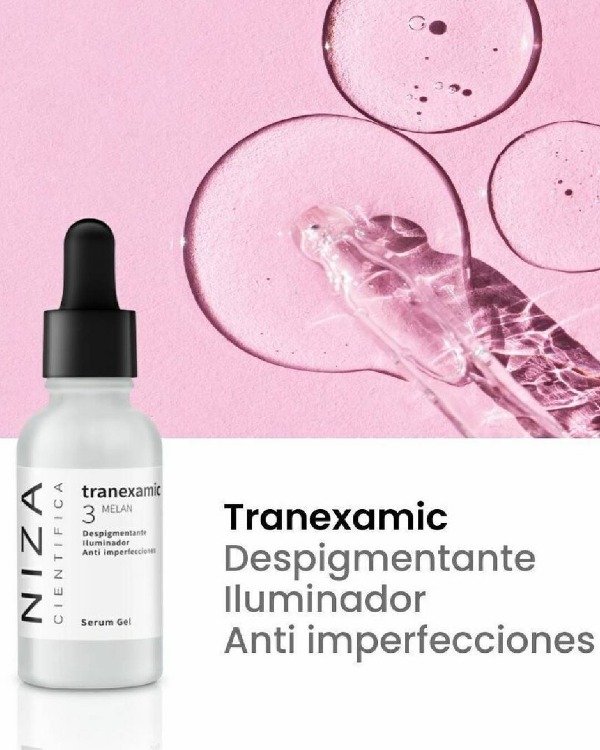 Inhibe la síntesis de melanina. Reduce la actividad de la tirosinasa de los melanocitos ayudando a controlar el melasma, la hiperpigmentación inducida por los rayos UV y otras hiperpigmentaciones posinflamatorias. El ácido Tranexámico actúa sobre todo tipo de manchas de origen melánico, pero debido a su mecanismo de acción, está especialmente indicado para aquellas que son más resistentes y recurrentes, como el melasma. Como todo tratamiento cosmético, no reemplaza la consulta médica. Textura suave y sedosa que se absorbe fácilmente en la piel, dejando una sensación refrescante y no grasa. Formulación única que combina la consistencia liviana de un gel con los ingredientes activos concentrados que se encuentran en un suero. Se recomienda su aplicación tópica y puntual sobre la mancha a tratar. Fortalece la función de barrera de la piel, por eso es ideal para pieles enrojecidas. Recomendado para pieles sensibles por su acción de exfoliación superficial.